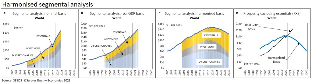 “Based on SEEDS analysis, aggregate global prosperity is likely to have peaked last year, at $88tn and will, by 2030, have fallen by a seemingly-modest 3%, though even this will equate to a 10% decrease in per capita terms. By 2040, aggregate prosperity is expected to have fallen by 16%, and its per capita equivalent by 27%, from their 2022 levels.”